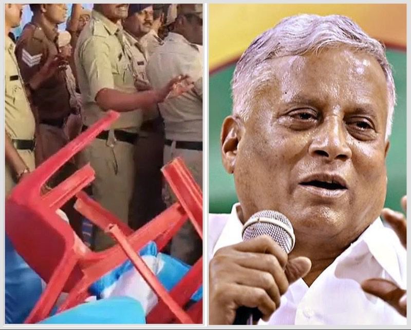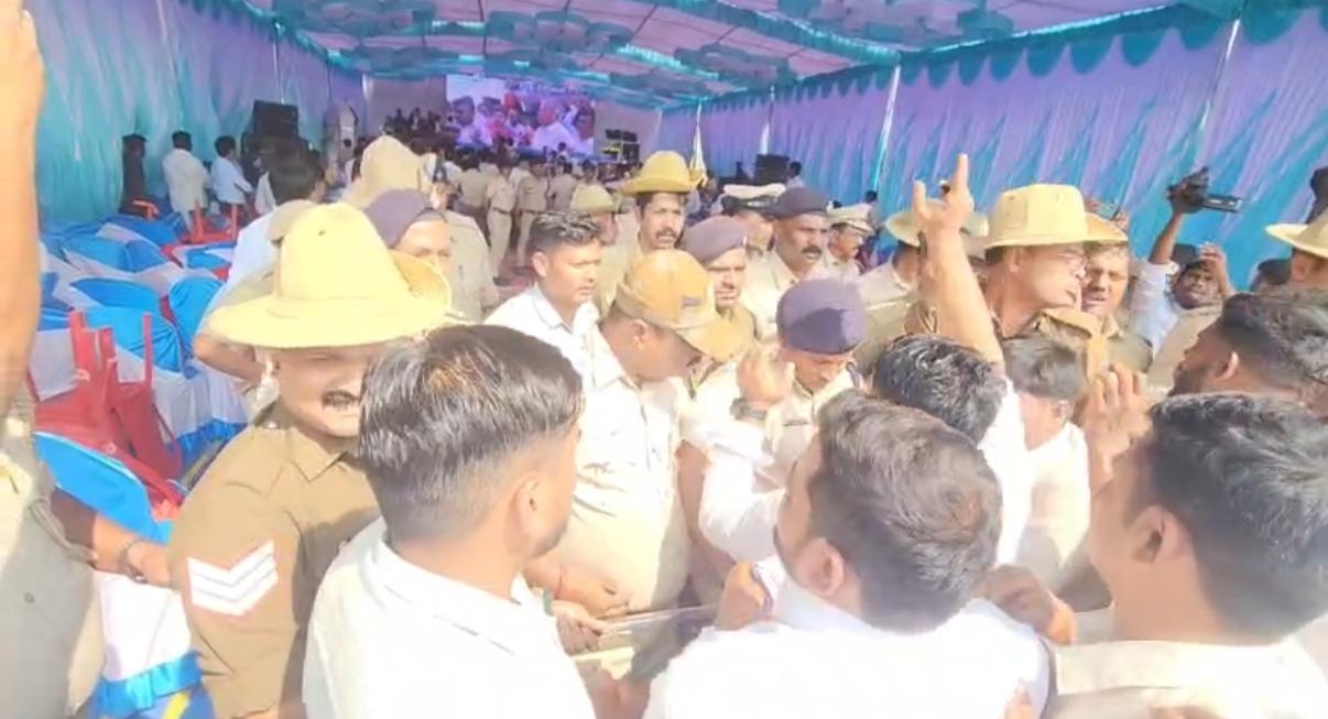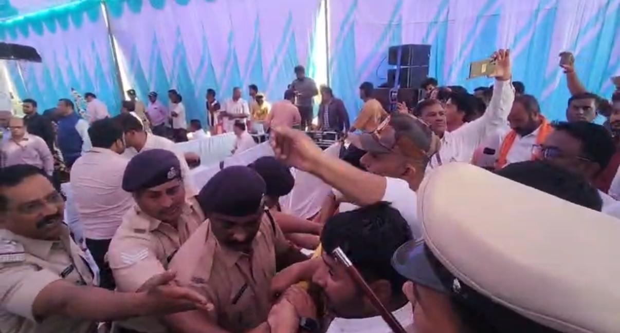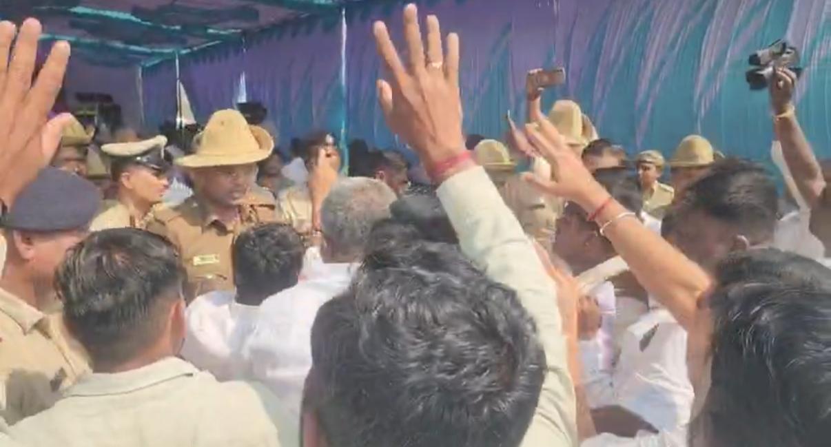 A railway flyover foundation event in Hitnal village turned chaotic when BJP and Congress workers clashed in front of Union Minister V. Somanna over alleged protocol violations. Congress supporters objected to the absence of District In-charge Minister Shivaraj Tangadagi and MP Rajshekhar Hitnal’s names on the event invitation.