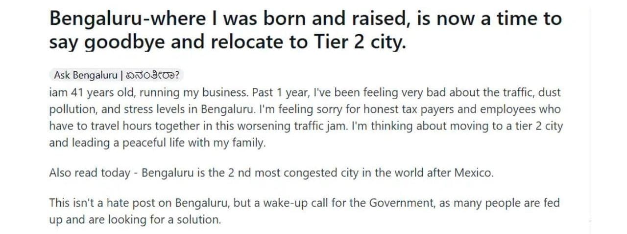 ನನಗೀಗ 41 ವರ್ಷವಾಗಿದ್ದು, ಸ್ವಂತ ವ್ಯವಹಾರ ನಡೆಸುತ್ತಿದ್ದೇನೆ. ಕಳೆದ ಒಂದು ವರ್ಷದಿಂದ ಬೆಂಗಳೂರಿನ ಟ್ರಾಫಿಕ್, ಧೂಳು ಮಾಲಿನ್ಯ ಮತ್ತು ಒತ್ತಡದ ಜೀವನ ತುಂಬಾ ಕಾಡುತ್ತಿವೆ. ಹೆಚ್ಚುತ್ತಿರುವ ಟ್ರಾಫಿಕ್ ಜಾಮ್ಗಳಲ್ಲಿ ಗಂಟೆಗಟ್ಟಲೆ ಪ್ರಯಾಣ ಮಾಡಬೇಕಾದ ನಿಷ್ಠಾವಂತ ತೆರಿಗೆದಾರರು ಮತ್ತು ಉದ್ಯೋಗಿಗಳ ಸ್ಥಿತಿ ನೋಡಿ ಬೇಸರವಾಗುತ್ತದೆ. ನನ್ನ ಕುಟುಂಬದೊಂದಿಗೆ ಬೆಂಗಳೂರು ಬಿಟ್ಟು ಬೇರೆ ಕಡೆ ಹೋಗಲು ಯೋಚನೆ ಮಾಡಿದ್ದೇನೆ ಎಂದು ಹೇಳಿದ್ದಾರೆ. ಅವರ ಹೇಳಿಕೆ ಬೆಂಗಳೂರು ನಗರದ ಜನದಟ್ಟಣೆ, ಟ್ರಾಫಿಕ್ ಅವಾಂತರದ ಸ್ಥಿತಿಗೆ ಕನ್ನಡಿ ಹಿಡಿದಿದೆ. ಬೆಂಗಳೂರಿನಲ್ಲೇ ಹುಟ್ಟಿ ಬೆಳೆದವರು ಕೂಡ ಈ ನಗರವನ್ನು ಬಿಟ್ಟು ಹೋಗುವ ನಿರ್ಧಾರಕ್ಕೆ ಬಂದಿದ್ದಾರೆ.