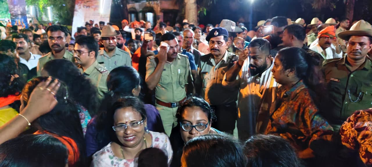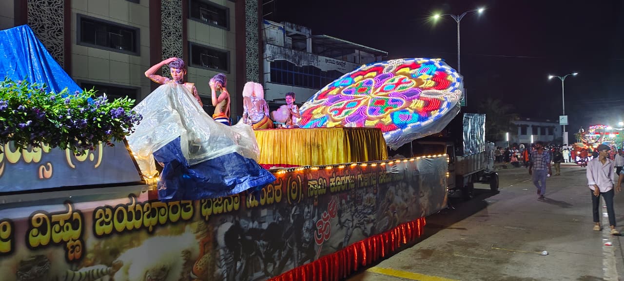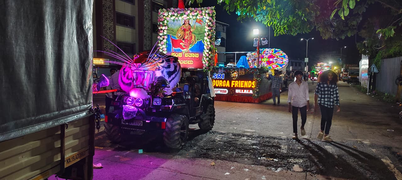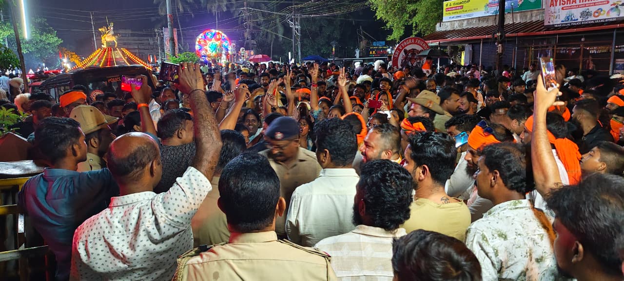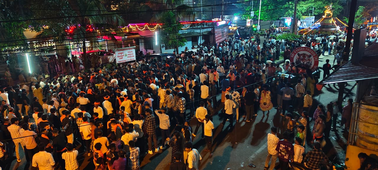 Midnight tensions flared in Ullal during the Dasara procession when police stopped the sound systems of tableaux near the station, sparking a clash with locals. Three youths were detained, leading to a roadblock protest where Sharada’s idol was placed on the street.