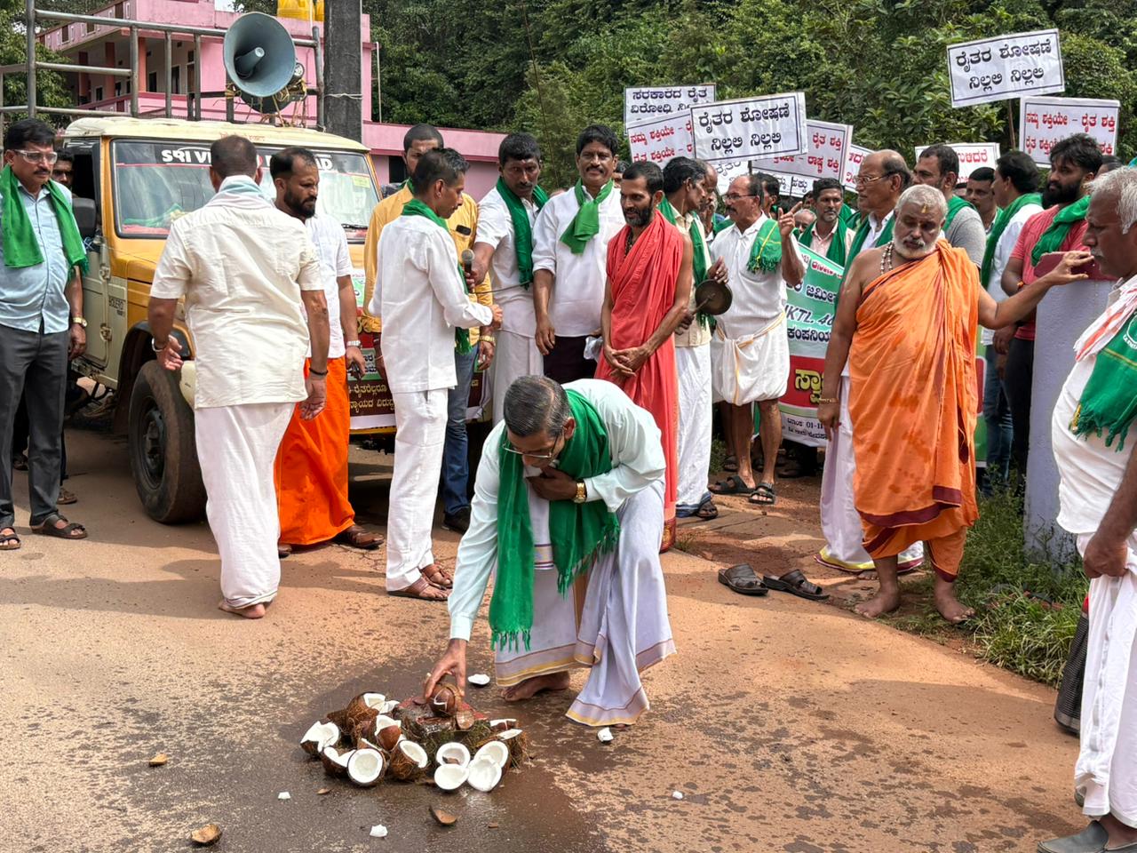A large group of farmers staged a protest at Ashwatthapura near Moodbidri on Saturday against the Udupi–Kasaragod 440 kV power line project, accusing the Star Light Power Company of destroying agricultural lands and using police force to suppress farmers’ voices.