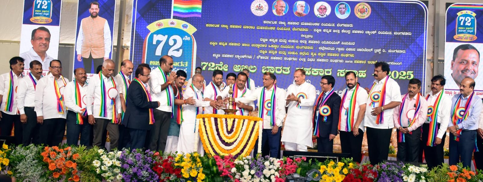 ಮಂಗಳೂರಿನ ಕರಾವಳಿ ಉತ್ಸವ ಮೈದಾನದಲ್ಲಿ ಭಾನುವಾರ ‘72ನೇ ಅಖಿಲ ಭಾರತ ಸಹಕಾರ ಸಪ್ತಾಹ-2025’ ಸಮಾರಂಭ ಉದ್ಘಾಟಿಸಿ ಅವರು ಮಾತನಾಡಿದರು. ಸಹಕಾರ ಸಂಸ್ಥೆಗಳ ಮೂಲಕ ಗ್ರಾಮೀಣ ಅಭಿವೃದ್ಧಿಯ ಬಲವರ್ಧನೆ’ ಪರಿಕಲ್ಪನೆಯಡಿ ನಡೆದ ಸಮಾವೇಶದಲ್ಲಿ ಮಾತನಾಡಿದ ಅವರು, ದೇಶದ ಆತ್ಮ ಗ್ರಾಮೀಣ ಮಟ್ಟದಲ್ಲಿದೆ. ಹಿಂದಿನಿಂದಲೂ ಮತ ಬೇಧ ಇಲ್ಲದೆ ಎಲ್ಲರೂ ಕೈಜೋಡಿಸುವ ಮೂಲಕ ಸಹಕಾರಿ ಶಕ್ತಿಯನ್ನು ಇನ್ನಷ್ಟು ಬಲಗೊಳಿಸಿದ್ದಾರೆ. ಎಲ್ಲ ಸಹಕಾರಿಗಳೂ ದೇಶಕ್ಕೆ ಕೊಡುಗೆ ನೀಡಿದ್ದಾರೆ. ಇದಕ್ಕೆ ಕರಾವಳಿ ಕೂಡ ಹೊರತಾಗಿಲ್ಲ ಎಂದರು.
