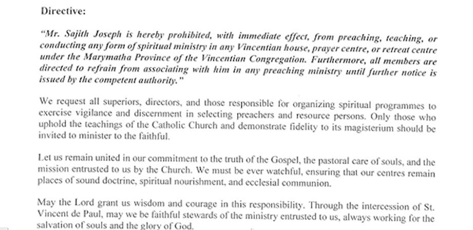 ವಿನ್ಸೆಂಟಿಯನ್ ಚರ್ಚ್ ಆಡಳಿತವು ಈ ಬಗ್ಗೆ ಹೇಳಿಕೆ ಬಿಡುಗಡೆ ಮಾಡಿದ್ದು ತಕ್ಷಣದಿಂದಲೇ ಅನ್ವಯವಾಗುವಂತೆ ಸಜಿತ್ ಜೋಸೆಫ್ ಪ್ರಾರ್ಥನೆ, ಬೋಧನೆಗೆ ನಿಷೇಧ ವಿಧಿಸಿದ್ದಾಗಿ ಹೇಳಿಕೊಂಡಿದೆ. “ಸಮುದಾಯದ ಅನೇಕರು, ಪ್ರಾರ್ಥನಾ ಕೇಂದ್ರದ ಪ್ರಮುಖರು ವಿಡಿಯೋ ಕ್ಲಿಪಿಂಗ್ ಜೊತೆಗೆ ದೂರು ನೀಡಿರುವುದನ್ನು ಗಂಭೀರವಾಗಿ ಪರಿಗಣಿಸಿದ್ದೇವೆ. ಸಜಿತ್ ಜೋಸೆಫ್ ಬೋಧನೆಯಲ್ಲಿ ಕೆಥೋಲಿಕ್ ಚರ್ಚ್ ಪ್ರವರ್ತಿಸುವ ಪವಿತ್ರ ವಿಧಿಗಳ ಕುರಿತು ತಪ್ಪು ಸಂದೇಶ ಇರುವುದನ್ನು ಗಮನಿಸಿದ್ದೇವೆ. ತನ್ನ ಬೋಧನೆಯಲ್ಲಿ ಹೊಸ ಮಾದರಿಯ ಮಾರ್ಸಿಯೋನಿಸಮ್ ಬಗ್ಗೆ ಪ್ರಮೋಟ್ ಮಾಡುತ್ತಿದ್ದು, ಇದನ್ನು ಚರ್ಚ್ ಫಾದರ್ ಗಳು ಒಕ್ಕೊರಲಿನಿಂದ ಖಂಡಿಸಿದ್ದಾರೆ.
