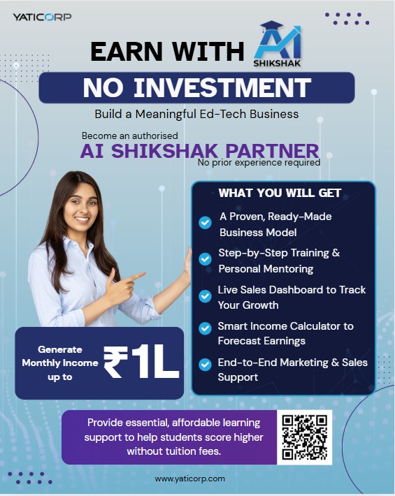 AI Shikshak, an AI-powered exam preparation tool for SSLC and PUC students, has gained huge popularity across Karnataka. To expand its reach, Yaticorp has launched a state-wide campaign inviting unemployed youths, self-help group members, working professionals, teachers, students, housewives, and freelancers to become distributors — with zero investment.