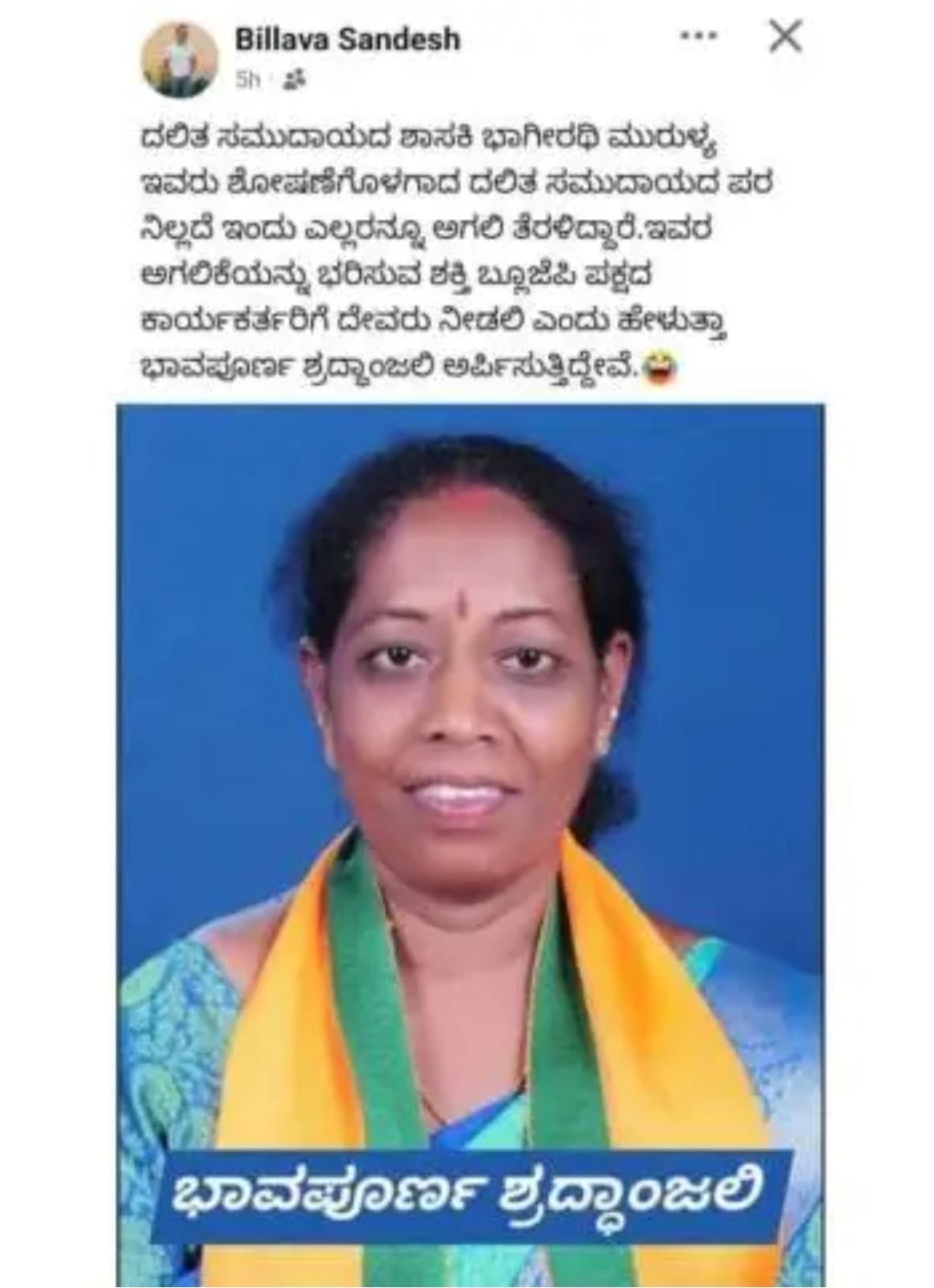 ಬಿಲ್ಲವ ಸಂದೇಶ್ ಎಂಬ ಹೆಸರಿನಲ್ಲಿ ಫೇಸ್ಬುಕ್ ಖಾತೆಯಿಂದ ಪೋಸ್ಟ್ ಮಾಡಲಾಗಿದೆ. ಸುಳ್ಯ ಶಾಸಕಿ ಭಾಗೀರಥಿ ಮುರುಳ್ಯ ಅವರ ಚಿತ್ರ ಬಳಸಿ ಅವರನ್ನು ನಿಂದಿಸಿ, ಅವಹೇಳನ ಮಾಡುವ ರೀತಿಯಲ್ಲಿ ಪೋಸ್ಟ್ ಮಾಡಲಾಗಿದೆ. ಪೋಸ್ಟ್ ಸಾಮಾಜಿಕ ಜಾಲತಾಣದಲ್ಲಿ ವೈರಲ್ ಆಗಿದ್ದು, ವ್ಯಾಪಕ ಖಂಡನೆ ವ್ಯಕ್ತವಾಗಿದೆ. ಜಾಲತಾಣದಲ್ಲಿ ಹರಿದಾಡುತ್ತಿರುವ ಪೋಸ್ಟ್ ನಲ್ಲಿ ” ದಲಿತ ಸಮುದಾಯದ ಶಾಸಕಿ ಭಾಗೀರಥಿ ಮುರುಳ್ಯ ಶೋಷಣೆಗೊಳಗಾದ ದಲಿತ ಸಮುದಾಯದ ಪರ ನಿಲ್ಲದೆ ಇಂದು ಎಲ್ಲರನ್ನು ಅಗಲಿ ತೆರಳಿದ್ದಾರೆ. ಇವರ ಅಗಲಿಕೆಯ ಶಕ್ತಿ ಬ್ಲೂಜೇಪಿ ಪಕ್ಷದ ಕಾರ್ಯಕರ್ತರಿಗೆ ದೇವರು ನೀಡಲಿ ಎಂದು ಹೇಳುತ್ತಾ ಭಾವಪೂರ್ಣ ಶ್ರದ್ಧಾಂಜಲಿ ಅರ್ಪಿಸುತ್ತಿದ್ದೇವೆ" ಅಂತ ಪೋಸ್ಟ್ ಹಾಕಲಾಗಿದೆ.