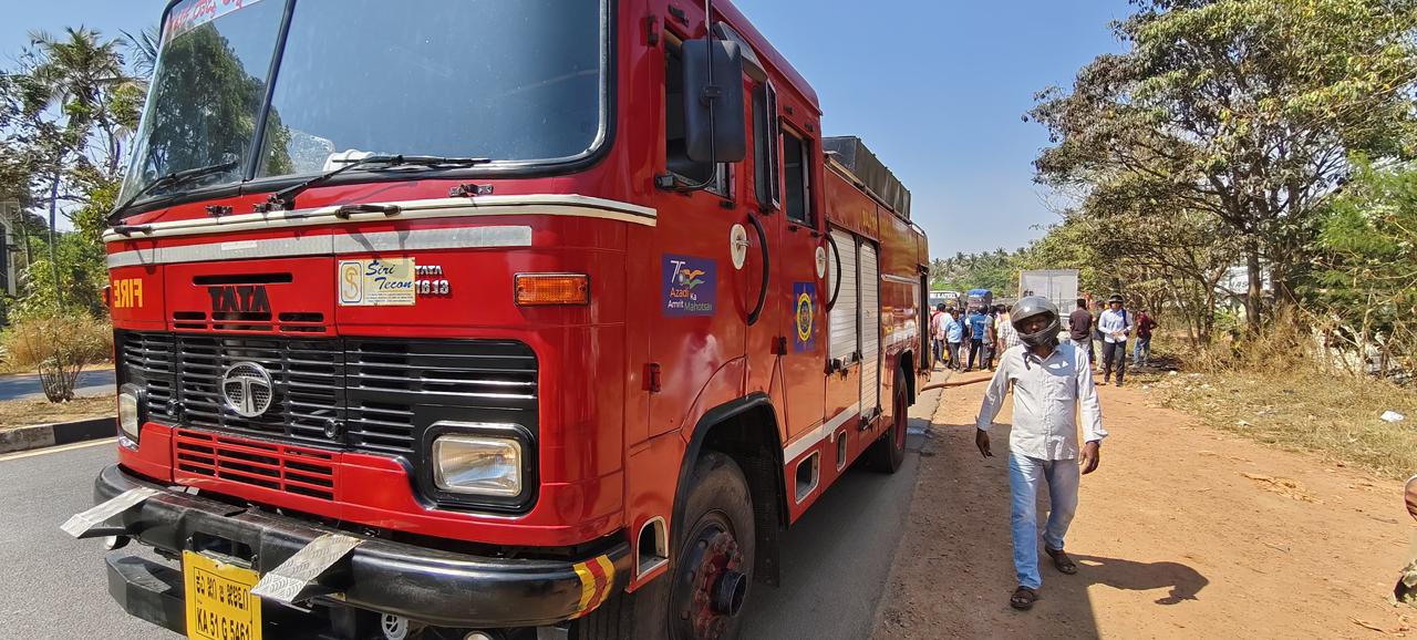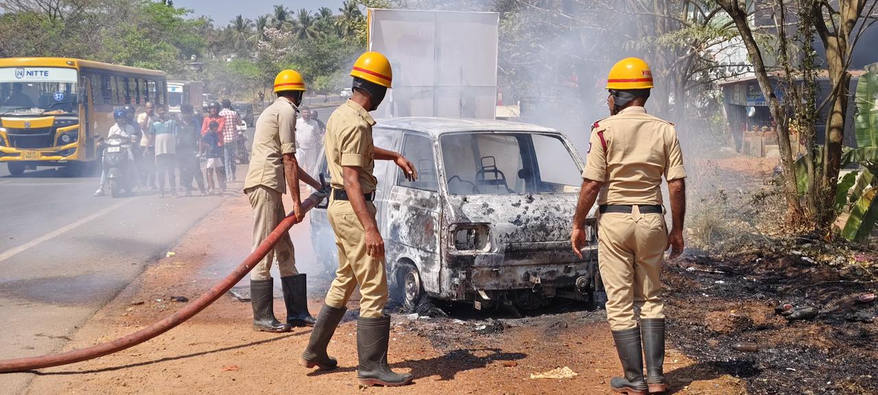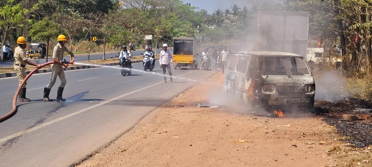 An Omni car suddenly caught fire while moving on NH-66 near Kotekar Adka. The driver, Riyaz from Talapady, was alerted by a motorist behind him and managed to escape safely. The vehicle was completely gutted despite quick action by fire personnel. A full petrol tank is suspected to have worsened the blaze.