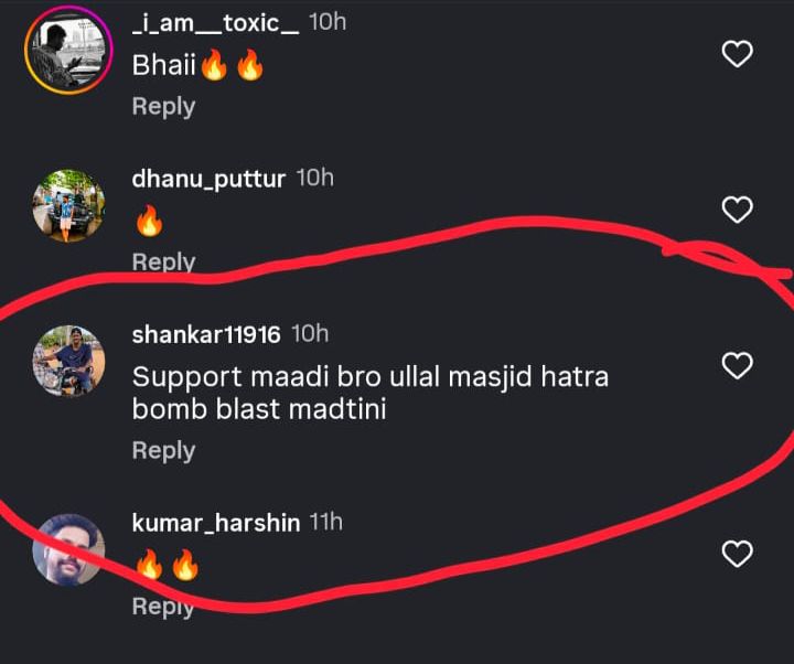ಬಜ್ಪೆಯಲ್ಲಿ ಕಳೆದ ವರ್ಷ ದುಷ್ಕರ್ಮಿಗಳಿಂದ ಬರ್ಬರವಾಗಿ ಹತ್ಯೆಗೀಡಾಗಿದ್ದ ಸುಹಾಸ್ ಶೆಟ್ಟಿಯ ಭಾವಚಿತ್ರವುಳ್ಳ ಇನ್ಸ್ಟಾ ಪೋಸ್ಟ್ ಒಂದರಲ್ಲಿ shankar11916 ಎಂಬ ಇನ್ಸ್ಟಾ ಖಾತೆಯಿಂದ "ಸಪೋರ್ಟ್ ಮಾಡಿ ಬ್ರೋ ಉಳ್ಳಾಲ ಮಸ್ಜಿದ್ ಹತ್ರ ಬಾಂಬ್ ಬ್ಲಾಸ್ಟ್ ಮಾಡ್ತೀನಿ" ಎಂಬ ಪ್ರಚೋದನಕಾರಿ ಸಂದೇಶವನ್ನು ಹಾಕಲಾಗಿದ್ದು,ಈ ಪೋಸ್ಟ್ ವೈರಲ್ ಆಗಿತ್ತು.
