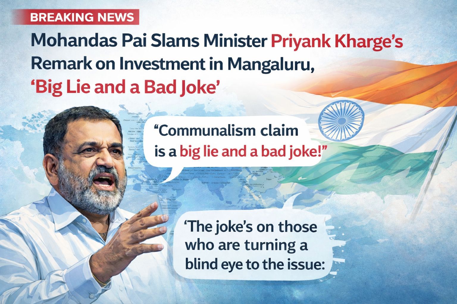 ಬೆಂಗಳೂರು, ಫೆ.17: ಕೋಮುವಾದದಿಂದ ಮಂಗಳೂರಿಗೆ ಹೂಡಿಕೆದಾರರು ಬರುತ್ತಿಲ್ಲ ಎಂಬ ಸಚಿವ ಪ್ರಿಯಾಂಕ್ ಖರ್ಗೆ ಹೇಳಿಕೆಗೆ ಉದ್ಯಮಿ ಮೋಹನದಾಸ್ ಪೈ ತಿರುಗೇಟು ಕೊಟ್ಟಿದ್ದಾರೆ.