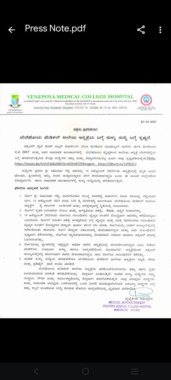 ಯೇನಪೋಯ ಮೆಡಿಕಲ್ ಕಾಲೇಜು ಆಸ್ಪತ್ರೆಯ ಪರಿಶೀಲನೆಗೆ ಒಳಗಾಗದ ತಪ್ಪು ಹಾಗೂ ಭ್ರಮೆ ಉಂಟು ಮಾಡುವ ಮಾಹಿತಿ ಹಂಚುವುದನ್ನು ತೀವ್ರವಾಗಿ ಖಂಡಿಸುತ್ತೇವೆ. ಇಂತಹ ಸುಳ್ಳು ಸುದ್ದಿಗಳು ನಮ್ಮ ಸಂಸ್ಥೆಯ ಗೌರವ ಹಾಗೂ ಕಾರ್ಯದಕ್ಷತೆಯನ್ನು ಹಾನಿಗೊಳಿಸುತ್ತದೆ. ಮಾಧ್ಯಮ ಸಂಸ್ಥೆಗಳು ಆರೋಗ್ಯ ಸಂಸ್ಥೆಗಳ ಮೇಲೆ ತಪ್ಪು ಕಲ್ಪನೆ ಮೂಡಿಸುವ ಸುದ್ದಿ ಹರಡುವ ಮೊದಲು ವಾಸ್ತವ ತಿಳಿದುಕೊಳ್ಳಿ ಎಂದು ಮನವಿ ಮಾಡುತ್ತೇವೆ ಎಂದೇ ಯೇನಪೋಯ ಆಸ್ಪತ್ರೆಯ ವೈದ್ಯಕೀಯ ಅಧೀಕ್ಷಕರು ಸ್ಪಷ್ಟನೆಯಲ್ಲಿ ತಿಳಿಸಿದ್ದಾರೆ.
