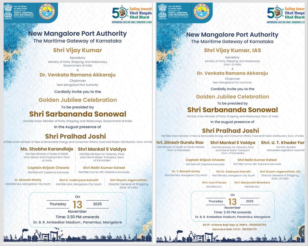 The New Mangalore Port Authority (NMPA) is celebrating its Golden Jubilee on November 13, marking 50 years since its establishment. However, the event has triggered a major political controversy after the official invitation omitted the names of state ministers and local Congress representatives, violating government protocol.