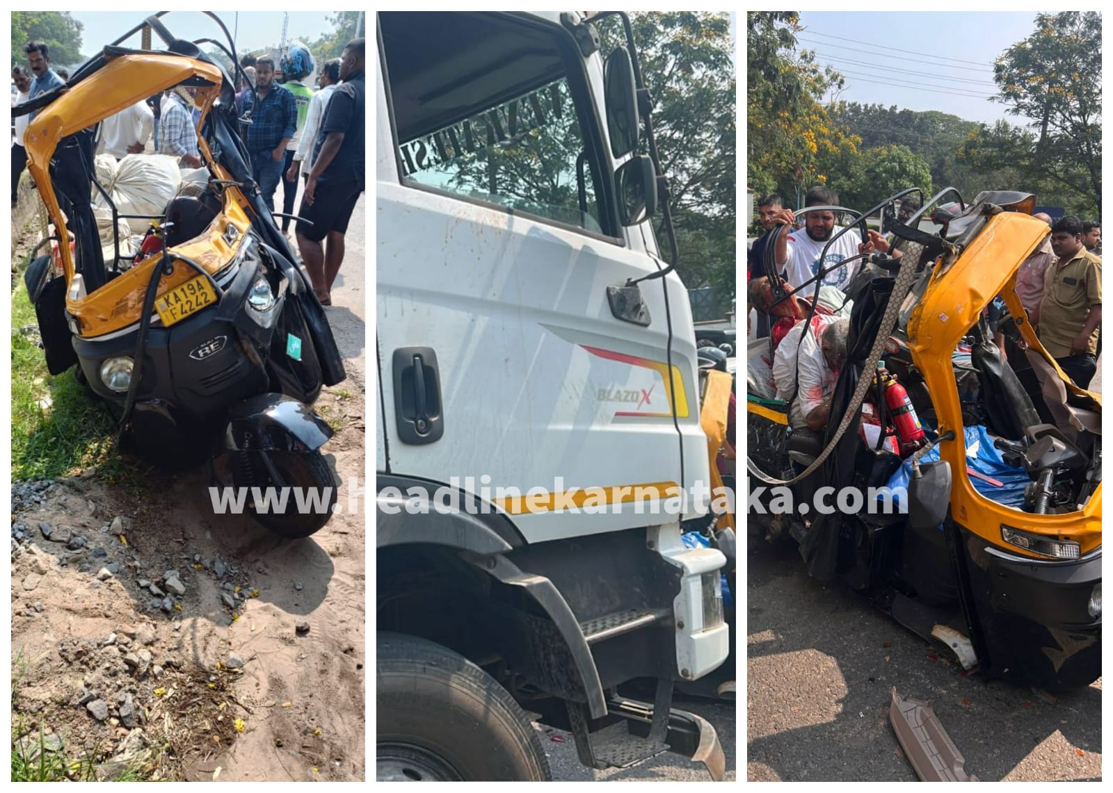 A tragic chain collision near Panambur Junction on the outskirts of Mangaluru claimed three lives after an auto-rickshaw got sandwiched between two tanker lorries.