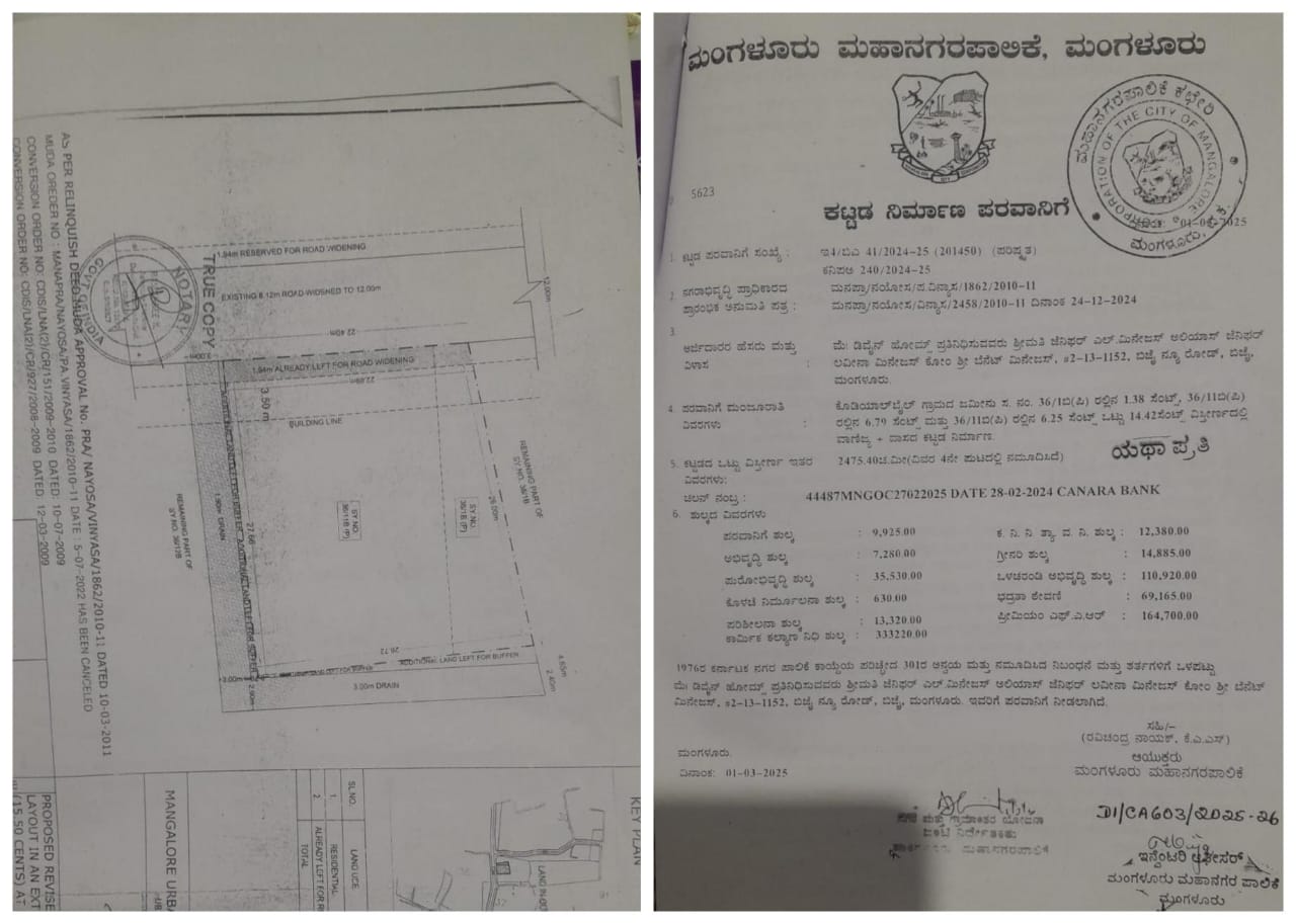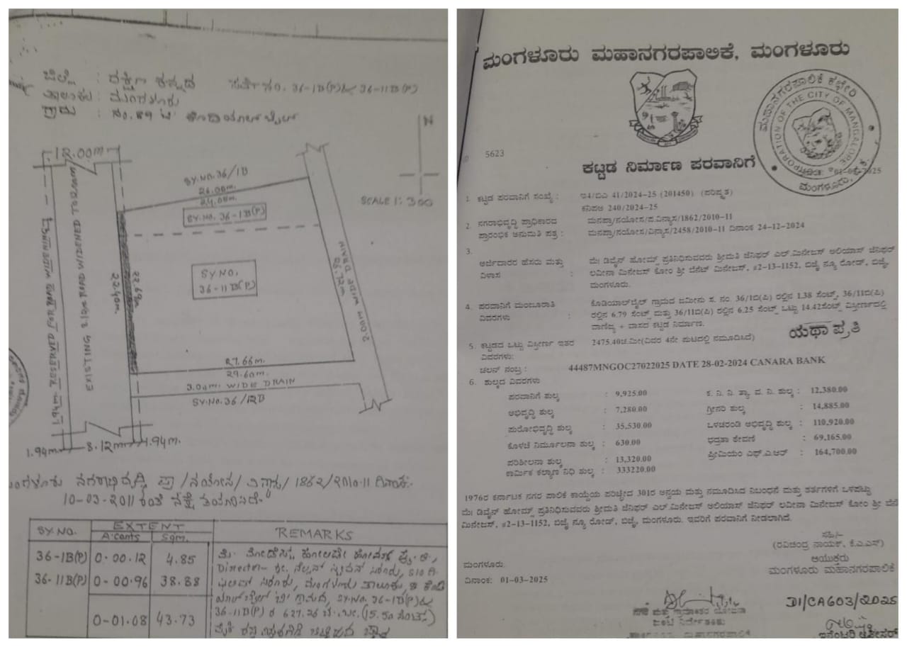 A major land-encroachment scandal has surfaced in Mangaluru’s Bejai area, where a builder has allegedly violated the original land map by narrowing a three-meter drainage canal to just 1.5 meters and occupying portions of public road land to construct a five-storey apartment building. Social activists Colin D’Silva and Ajay Christopher D’Silva have filed complaints with the Mangaluru City Corporation (MCC) and MUDA, accusing survey and planning officials of colluding with the builder to alter land records and approve the project illegally.