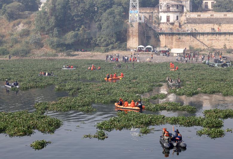 A shoe lies near a damaged suspension bridge after it collapsed on Sunday, in Morbi town in Gujarat, India