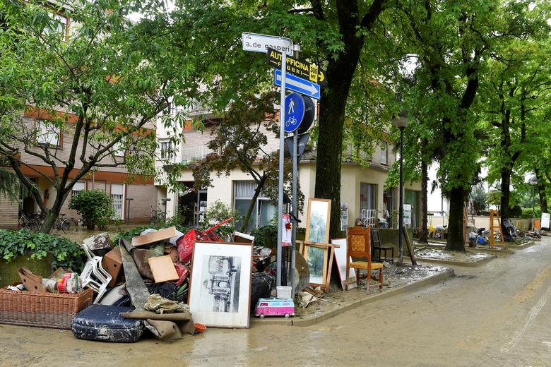 People embrace on a flooded street, after heavy rains hit Italy's Emilia Romagna region, in Faenza, Italy, May 18, 2023.