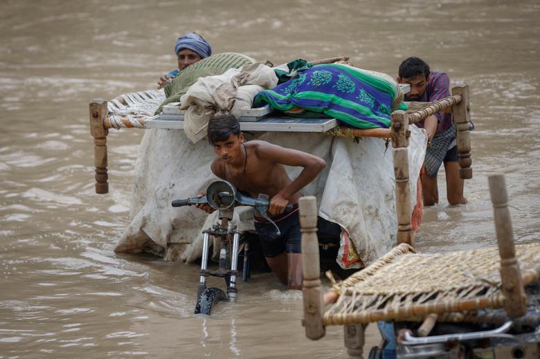 Residents carry their belongings on rickshaws through a flooded street after heavy monsoon rains in New Delhi, India, July 12, 2023.
